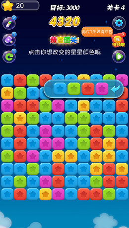 2、丰富的关卡挑战,不同的任务要求,一次性组织消除更多星星,赢得丰厚奖励;