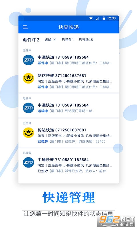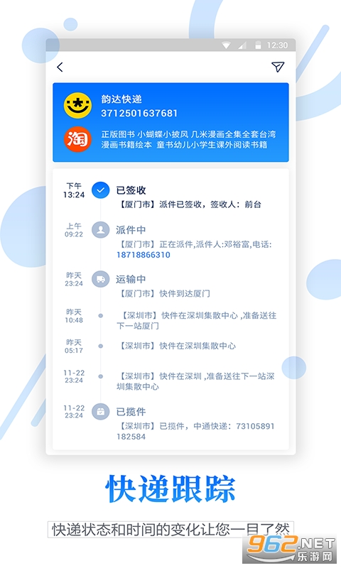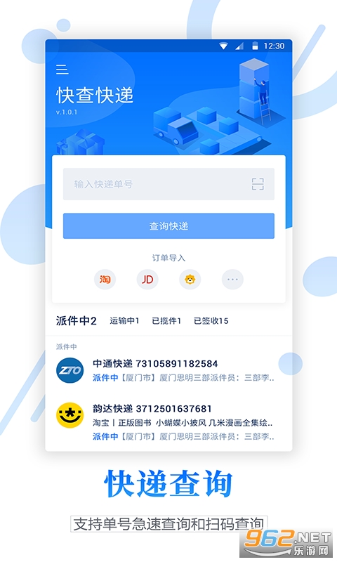 物流快递查询app,实时同步各大快递公司数据,支持淘宝,京东,天猫的包裹;支持顺丰,圆通,申通,韵达,德邦,中通,百世,邮政,EMS,DHL,中外运敦豪等国际,国内快递公司,支持物流状态更新提醒。