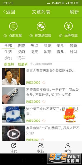 转发文章每次被阅读奖励5毛/次,每天收益满5元,可抽最高6.88元,满10元抽12.88元......等等