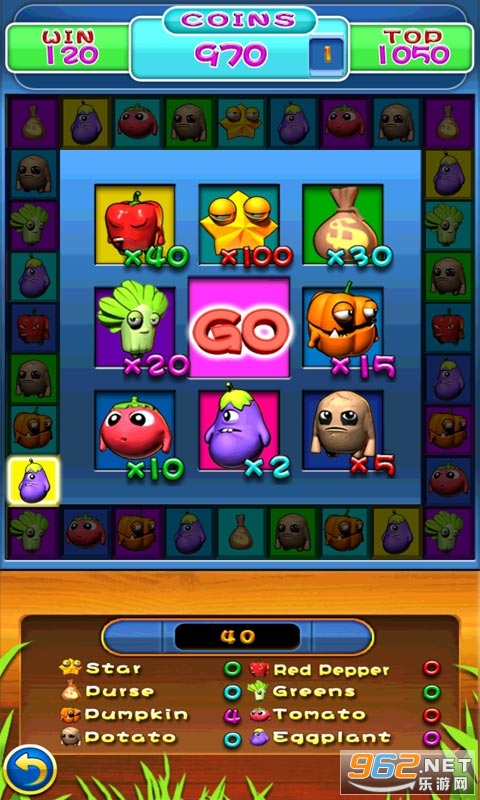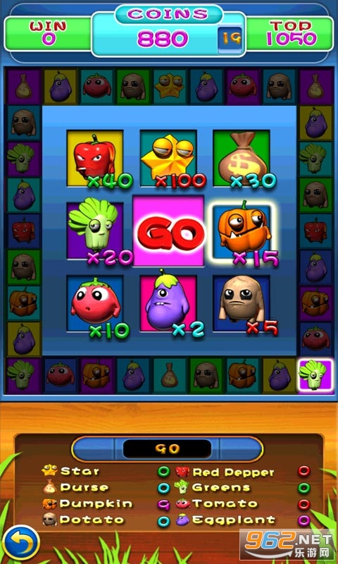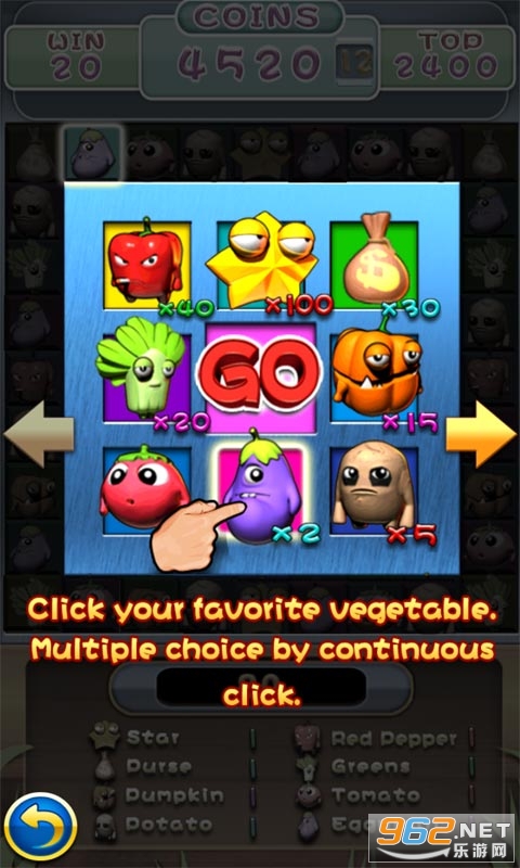 蔬菜大亨是一款休闲小游戏,在这款有趣的游戏中,你可以不花钱享受到和街机一样的乐趣.对于每个进入的玩家,游戏都将获得1000金币的启动资金,下注一次,消耗10个金币,让玩家白手起家创造财富。游戏画面和音效配合的很好,让玩家在轻松而又紧张的环境下进行下注.你能不能成为百万富翁那就看你运气了。