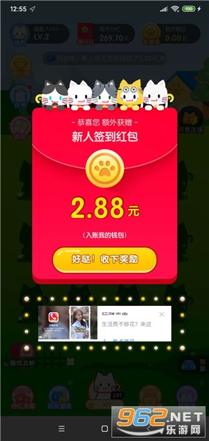 1、新用户下载注册疯狂合猫猫app即送2.88元,可直接提现0.3元秒到