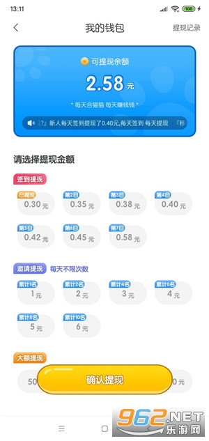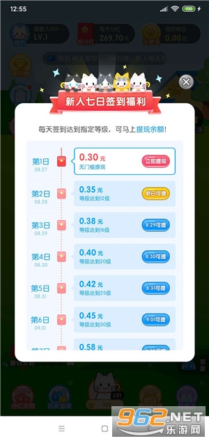 2、疯狂合猫猫新人七日签到福利,每天签到达到指定等级,可马上提现余额