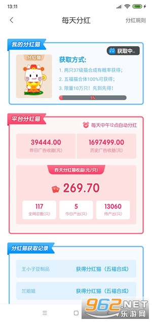 2、永久分红猫获取方式:两只37级猫合成有概率获得;五福猫(爱国、敬业、友善、和谐、富强)合体100%可获得;分红猫数量有限,先到先得