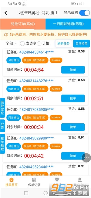 3、下载并登陆TT任务平台后,点击“接单首页”任选任务,或者点击右上角“自动抢单”即可接取任务,尽量接本省订单,基本不填资料,其次优先国外、外省、全部订单