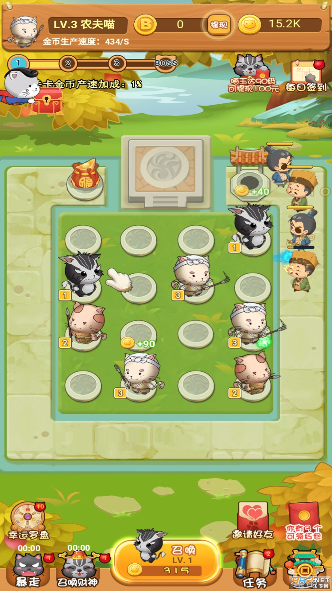 2、通过时段领取、抽奖、观看广告视频等方式获得金币,金币用来升级猫咪;
