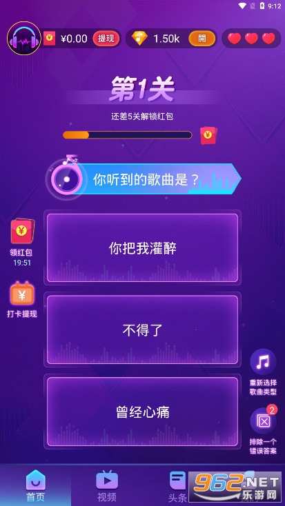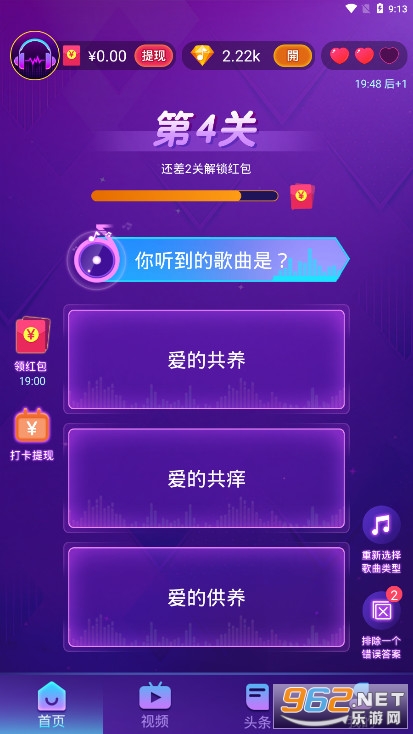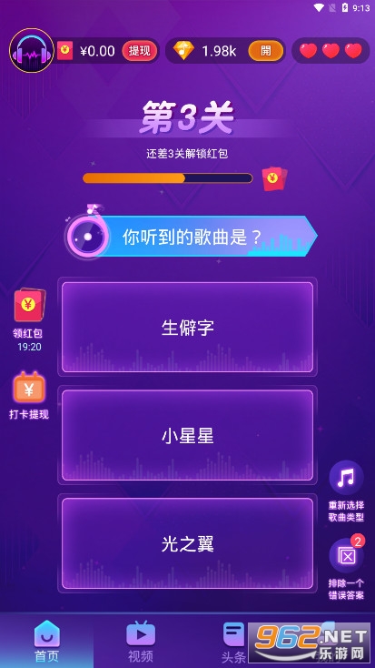 《疯狂猜歌红包版》是一款猜歌名赚红包小游戏,游戏中玩家要根据你听到的歌曲做出选择,三选一,答对获得金币奖励,金币可用于提现红包,打错扣除一个生命值,还可以去打卡赚红包,玩游戏到一定的时长也能赚钱,方式多种多样,快来试试吧。