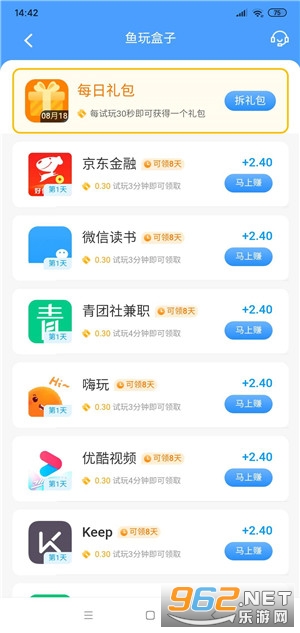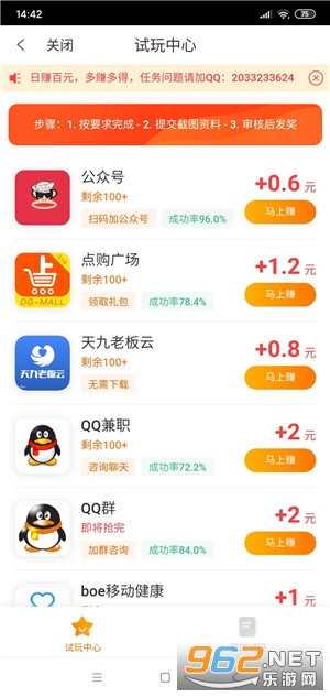 1、一分钟快速试玩任务,只需简单体验各类应用就能赚取1-3元佣金奖励,每试玩30秒还能获得一个礼包
