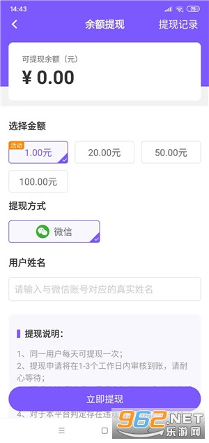 5、目前喵爱玩活动期间满1元即可提现到,后续满20元起提现,24小时内快速到账,不收取任何手续费