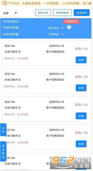 2、添加成功后,返回“接单首页”点击“免审核接单”或“自动抢单”即可领取任务。