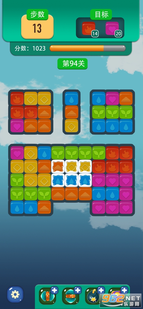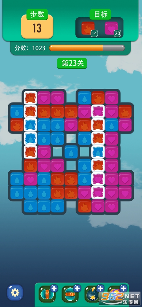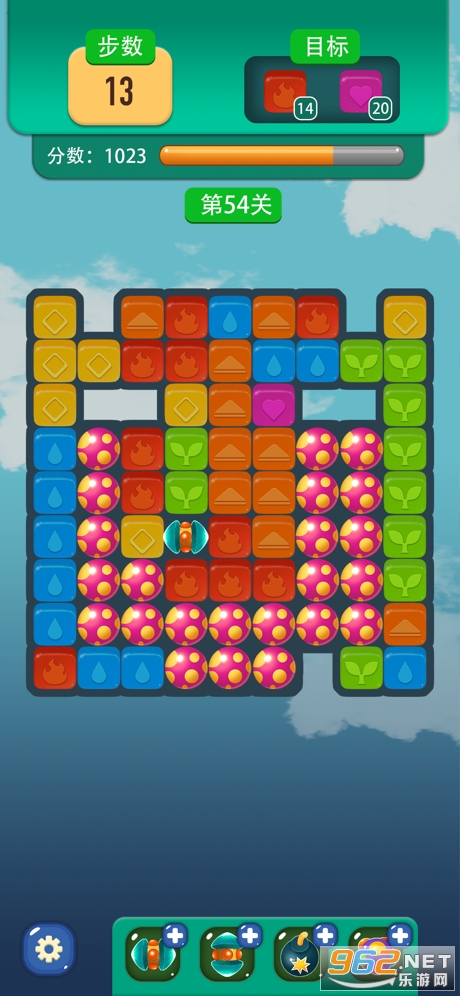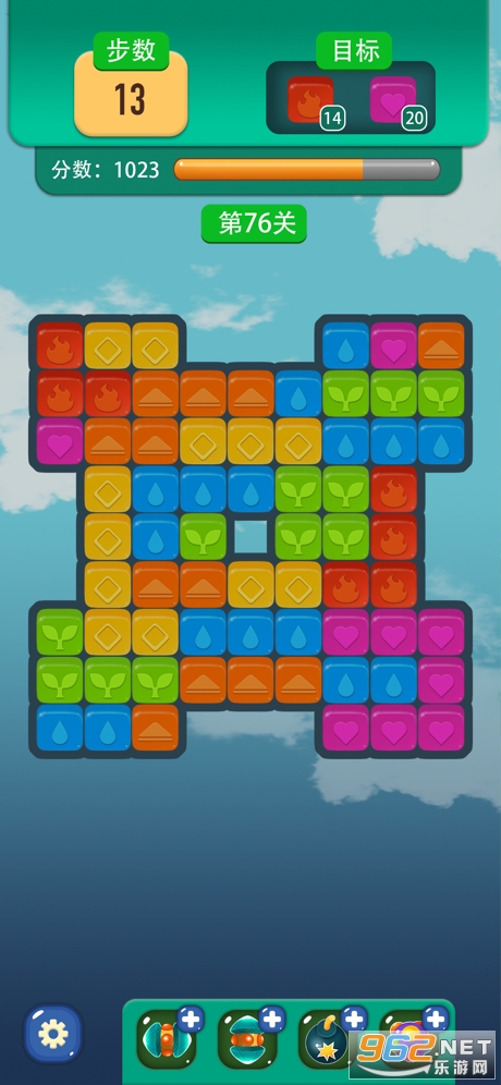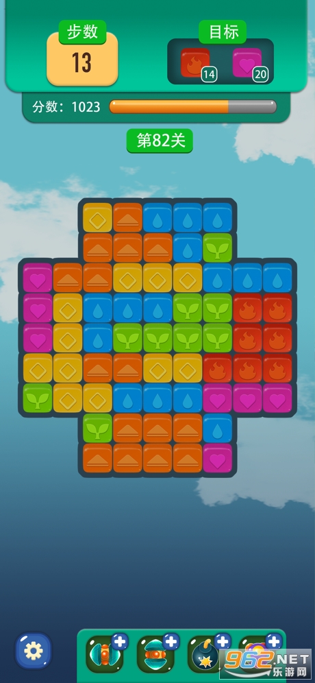 2、熟悉的三消玩法在这里带给你刺激,我们一起用不同的道具或者是自己的点击,消除一些方块;