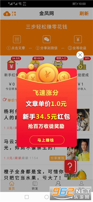 1、新用户下载注册金凤网app即送1元,还有34.5元红包可领,转发文章单价全天1元/阅读