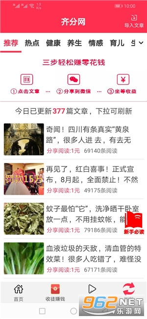 《齐分网app》是最新推出的一款转发文章赚钱的平台,齐分网app有着丰富的文章资源可以一键转发,阅读单价是1块钱,价格是很高了,可以多转发一些优质的文章和视频,让朋友来点击阅读,可以推广软件和收取徒弟来获得其他的收益。