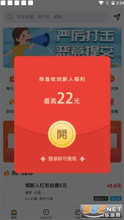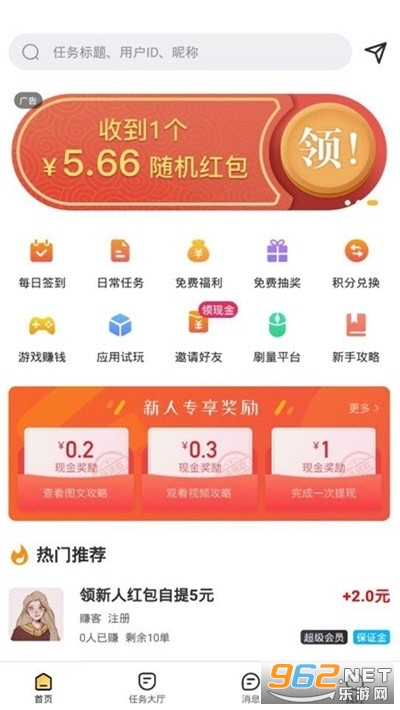 1.新用户下载注册后送0.88元的现金红包,试玩游戏和应用都可以获得奖励,新用户完成任务可以提现1元现金。