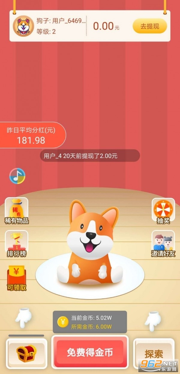 3、养狗狗,有钱花,领养你的专属狗仔,轻松获取金币,狗狗每升一级都能领取现金红包,等级越高赚钱越多。