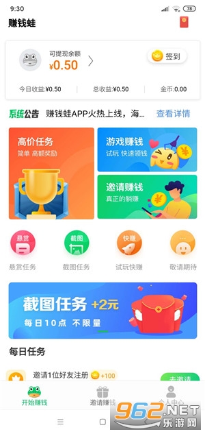 1、新用户下载注册赚钱蛙app登陆后新手现金奖励自动到账,平台上提供了超多简单的手机赚钱任务,按照要求试玩指定的APP就能获得1-2元佣金奖励