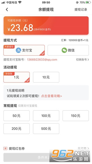 5、每日完成2次试玩领奖,即可提现1元秒到账,连续试玩领奖5天即可提现10元,满50元起无门槛提现,支持提现到/支付宝