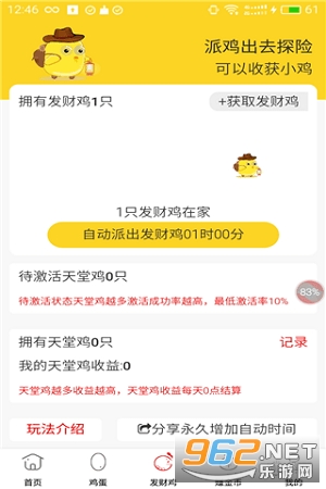 发财鸡可以旅行并抓回其他玩家的小鸡,发财鸡每带回6000只鸡(价值1.02元)就会变成待激活状态的天堂鸡,激活后可以变成天堂鸡获取永久收益!