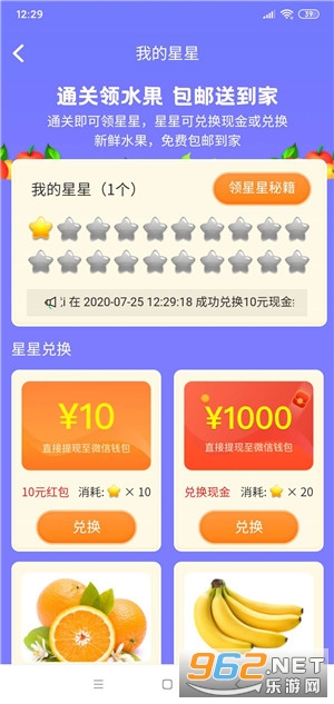 2、通过消星星领取通关红包即可获得星星,10个星星即可兑换水果或10元现金红包,20个星星即可兑换1000元现金,直接提现到