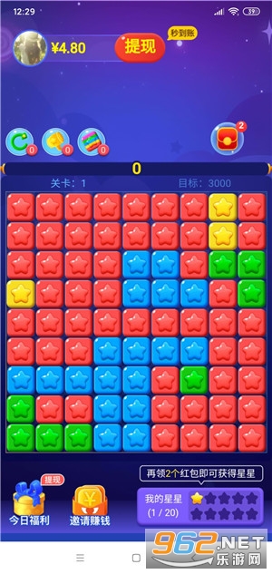 1、新用户下载注册开心消星星app就有一个大额新人红包,每次过关除了过关红包,还有好运降临红包可以领