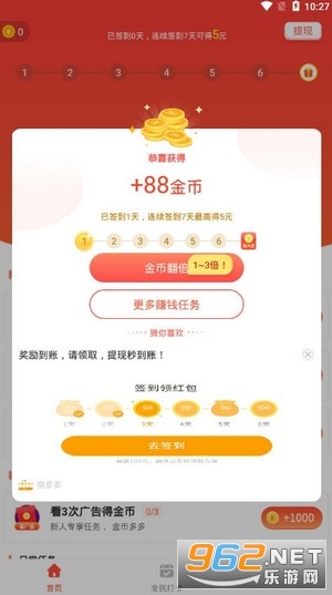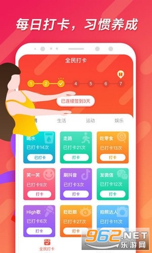 一款轻松给力的手机网赚app,通过每天签到打卡来赚钱,软件也没有任何门槛,所有人都可以参与,轻松获得零花钱,喜欢的老哥欢迎来962下载试玩吧!