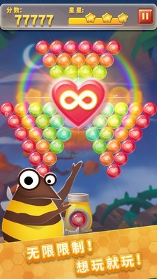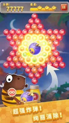 泡泡龙物语游戏拥有创意的玩法,全新的关卡模式和新颖的无尽模式;跟着呆萌小蜜蜂吉米和波比进行丛林收集蜂蜜。