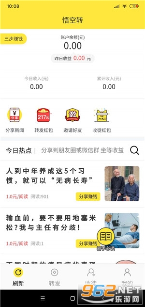 《悟空转app》是一款最新推出的转发文章赚钱的软件,悟空转app中有着众多的文章资讯,朋友们将这些文章转发到朋友圈即可,阅读量最高可以到1.7元的单价,这个价格已经非常的高了,软件还有着一些每日任务等可以领取,完成后也可以获得红包奖励。