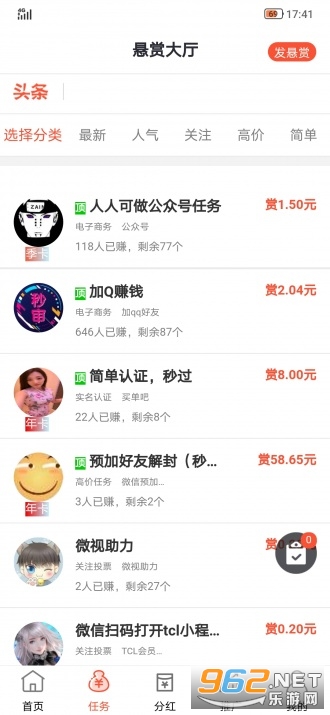 1、类似于众人帮的一款悬赏任务平台,平台小任务特别多,简单的任务几秒钟就能完成并拿到相应奖励。