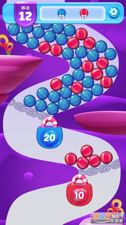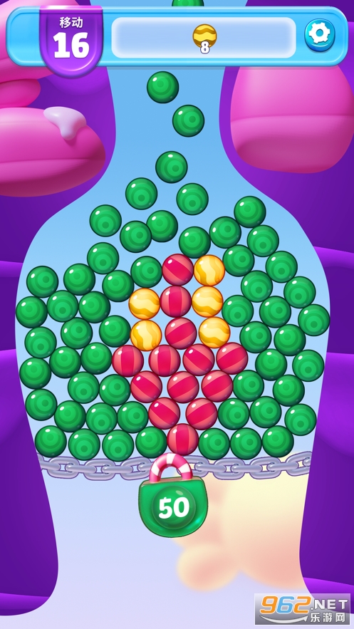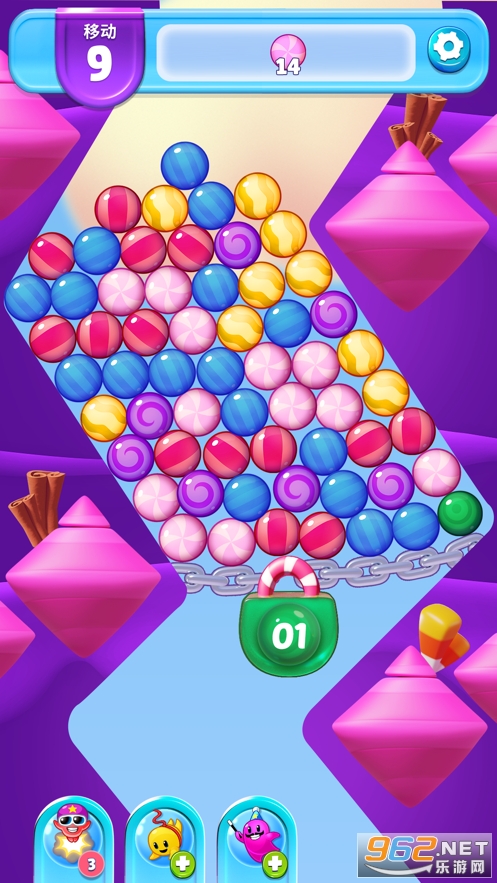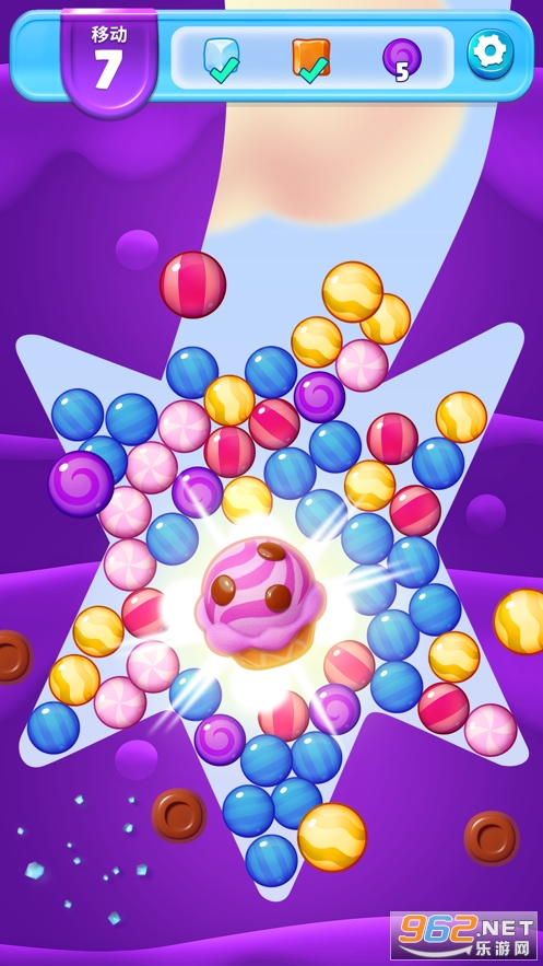 简单上手,点击相匹配的成堆糖果将其消除。四颗以上的糖果会组成一颗巧克力糖,能够立刻消除一大片糖果。将巧克力糖相互组合可以创造更强力的巧克力糖。依据策略顺次激活巧克力豆将糖果一扫而空完成挑战。