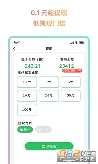 每天1元起提现,懒猫赚钱软件支持多种提现方式,快速到账。等你来赚钱。