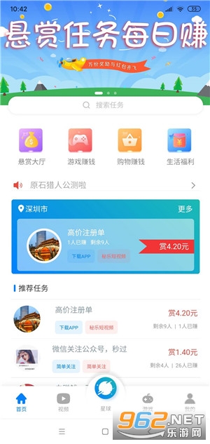 2、原石猎人实名认证成功后,就可以通过“首页”做悬赏任务赚钱,领取悬赏任务,按照要求做完任务即可提现审核并获得赏金