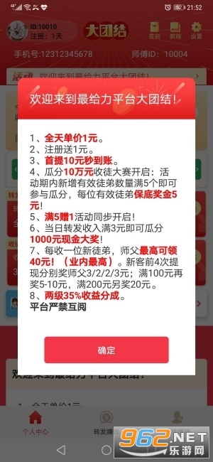 每邀请一名徒弟最高奖励35~40元,另外还可以享受35%二级提成,还可参与瓜分10万收徒活动