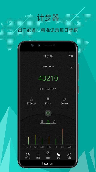 可记录每日,每周,每月步数,可设定目标完成度。可记录热量消耗,公里数和时间,万能计步器
