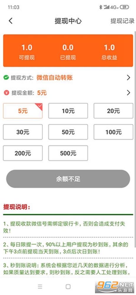 2、最低5元起提现到钱包,当天极速到账