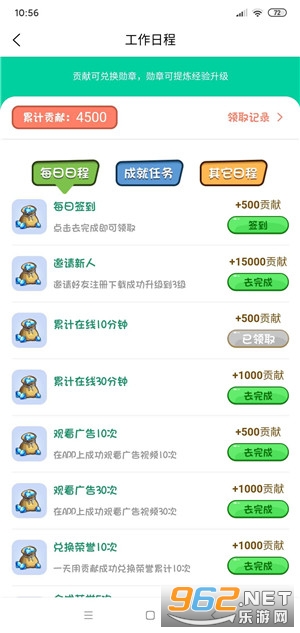 1、贡献获取:通过观看广告获取贡献、离线、转盘和工作日程里的任务也可获得贡献