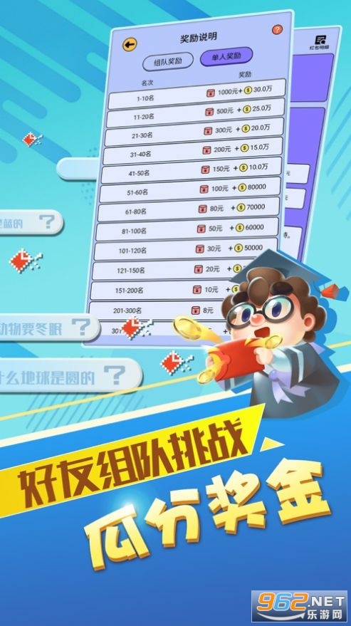 赏金答人红包版通过答题就可以获得丰厚的奖励,在这里闯关答题还可以获得抽奖的机会,有多种不同的答题模式可以选择,挑战、组队等都是可以选择的,这里的题目类型丰富,不仅可以让你赚到零花钱,还可以让你的知识面拓宽