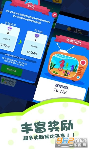 在这里,玩家可以养殖海洋各大品种的鱼类,通过这些鱼来提升你水族馆的等级,获得源源不断的收益,还有超多的免费奖励等你来拿;