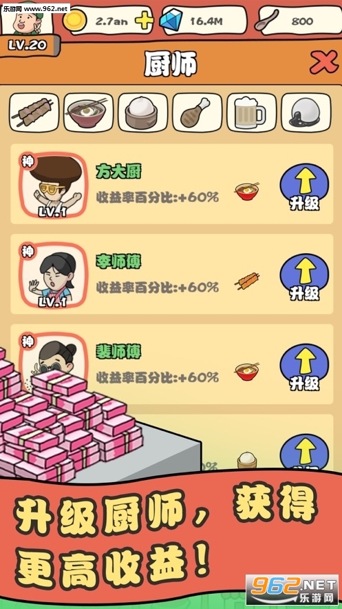 3、快速提高小吃街的等级,让你能够解锁更多高级的食谱,让更多有钱人在这里进餐;