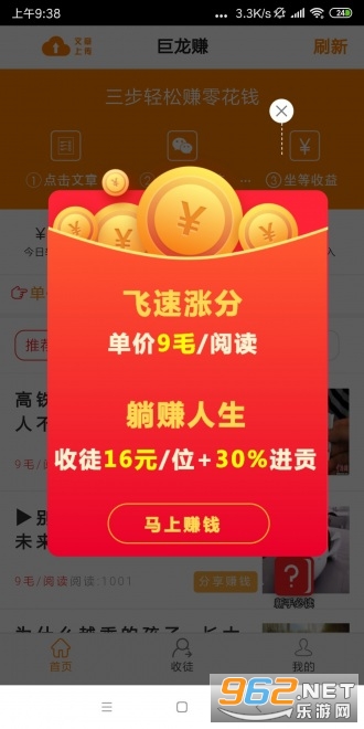 1、点击巨龙赚app右下角的“文章”样式图标打开文章列表,选择您喜欢的文章并打开,点击右下角“立即分享赚钱”按钮