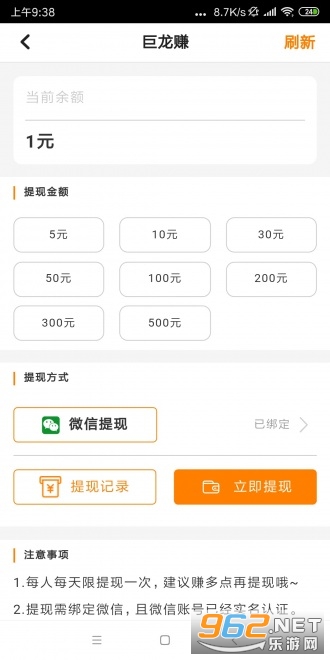首次满5元提现秒到账,之后满10元提现,24小时内到账
