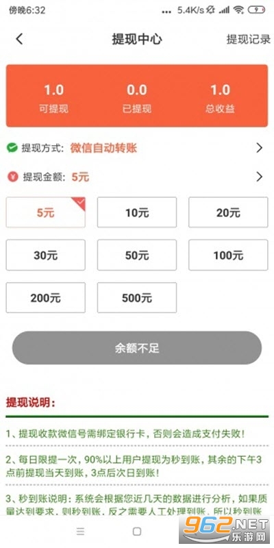 首次满5元提现,之后满10元提现,每天可提一次,支持提现到钱包,提现一般秒到账