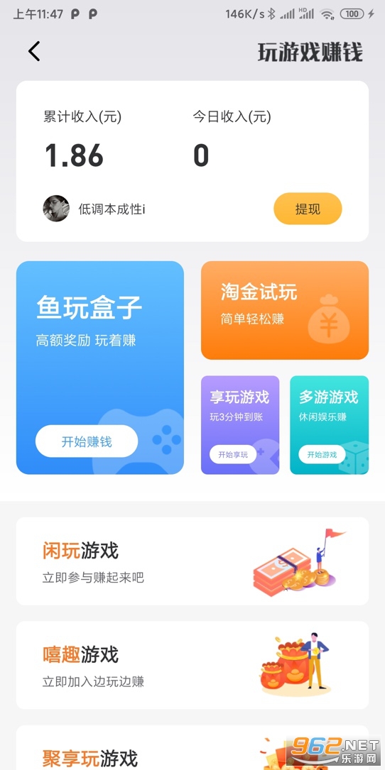 通过任务接单、游戏试玩、邀请好友等方式赚取资金。乐悬赏支持二级好友邀请,任务提成徒弟分6% 徒孙分2%,游戏提成徒弟50% 徒孙25%,最低一元即可提现秒到账,新用户还有3元红包奖励。