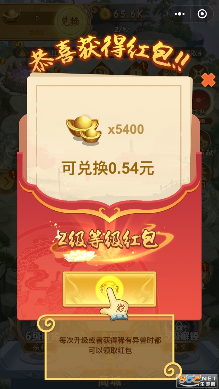 异兽每升一级,可领一次红包,一般在几毛左右,观看广告可翻倍。首次0.3元秒提,后续50元起