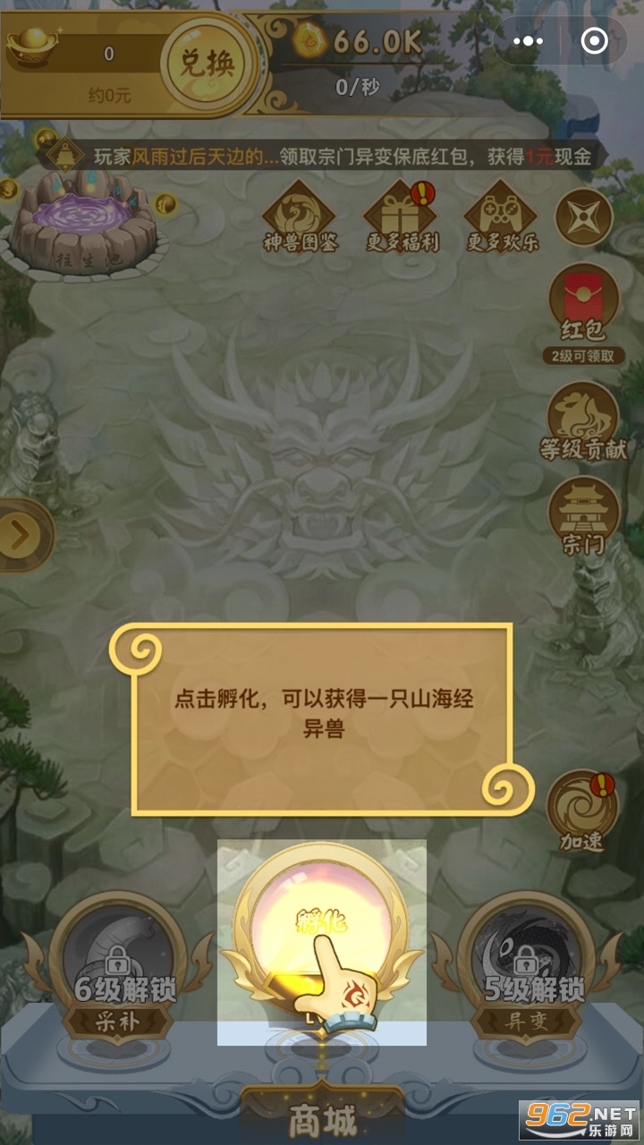 神兽鸿鹄:每天获得10元现金红包,最大异兽到达10级后宗门异变有概率获得