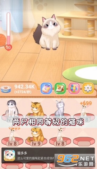 4、简单的挂机玩法,跟各种猫咪多多互动,能够加速它们的成长,合并生成更高等级。
