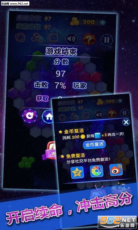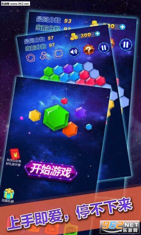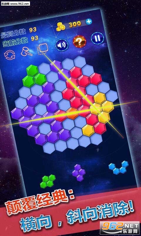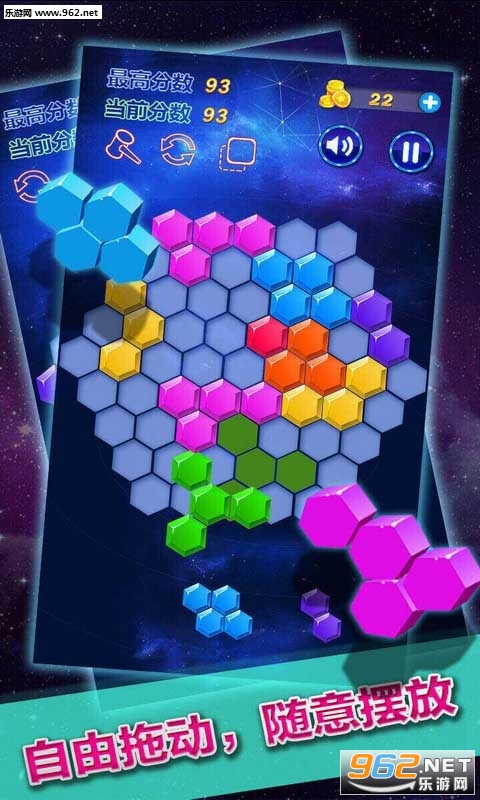 进入到游戏当中,只需要玩家把手滑动屏幕,移动了六边形到目标区域,即可完成消除。当然,当大家完成一排(横排、竖排、斜排)的时候,都可以消除掉一整排,从而获得高分。