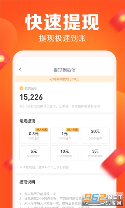 4、轻松提现:金币每天会自动兑换成零钱,1元即可提现,坚持运动,月入百元。
