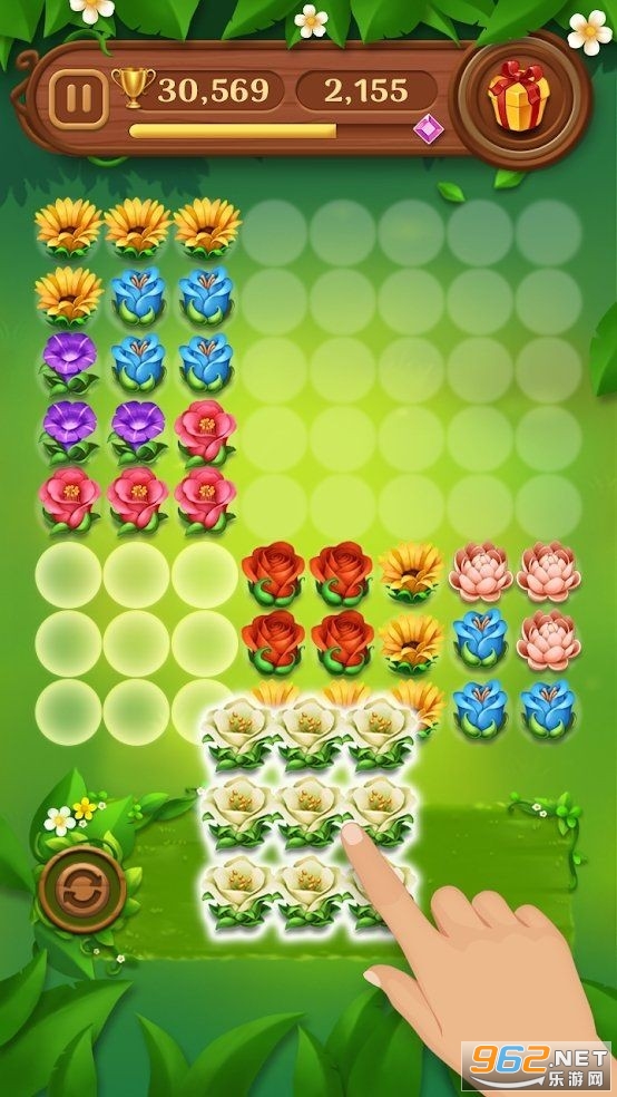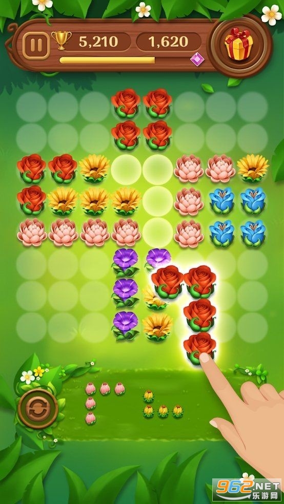 3、移动花朵,将它们种植到图板中,放置操作非常简单,不过玩家需要注意形状,契合的位置才能填充。