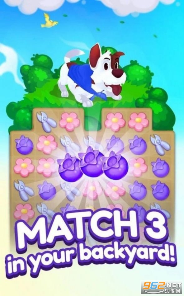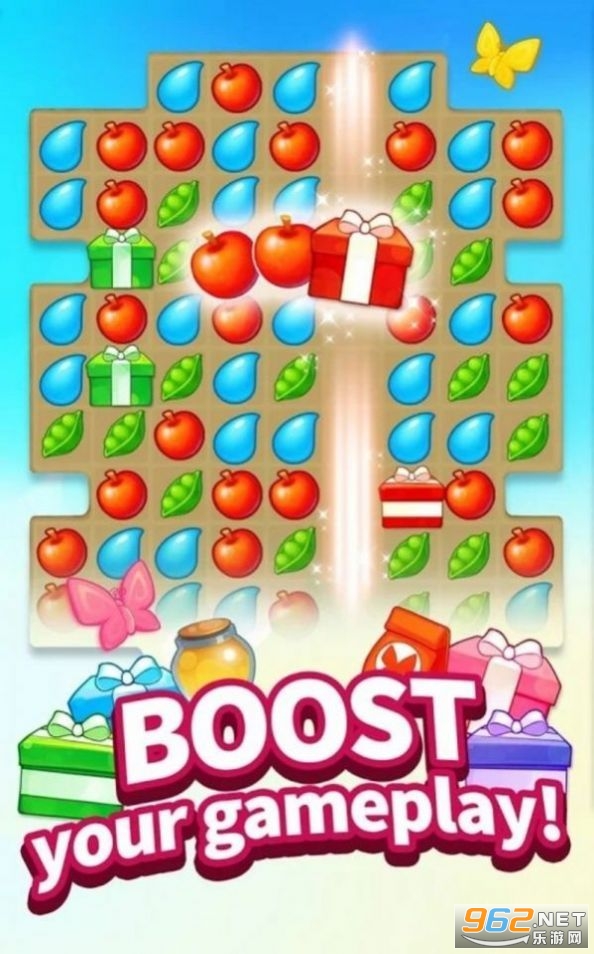 1、独特的消除小游戏,场景的设定非常的开阔,各种各样的水果摆在后院之中等待着你的消除;