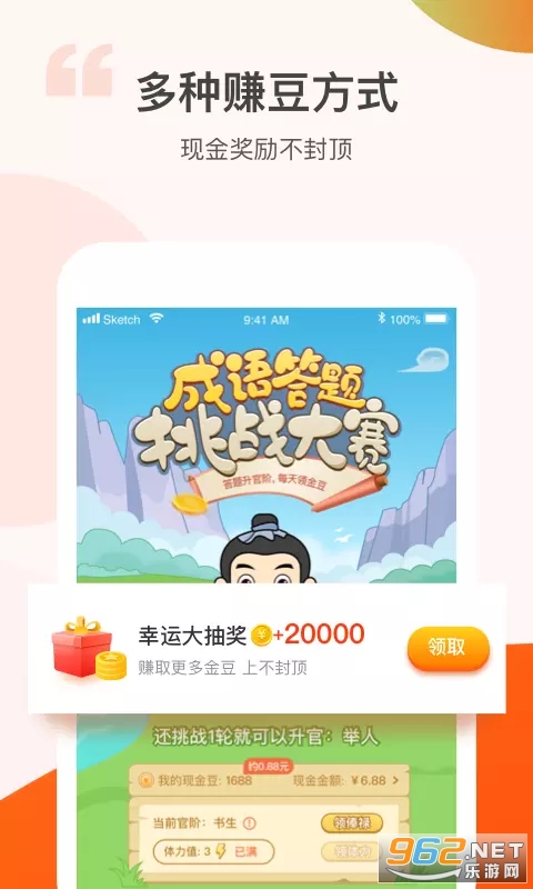 1、答题就能领金豆,多种赚豆方式,金豆可提现