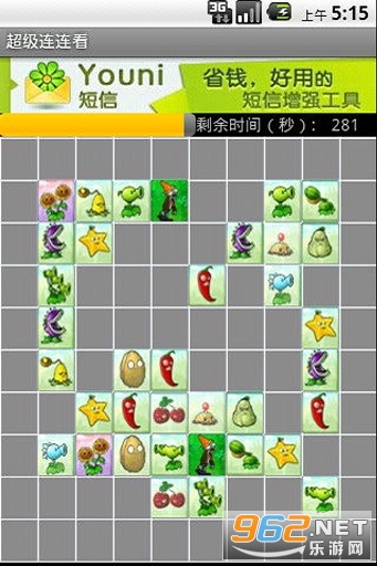 分别点击相同的两个图标,如果连接这两个图标的直线不超过三条,并且不能碰到其他图标,则消除图标,直到最终将图片全部消除,有时间限制哦。